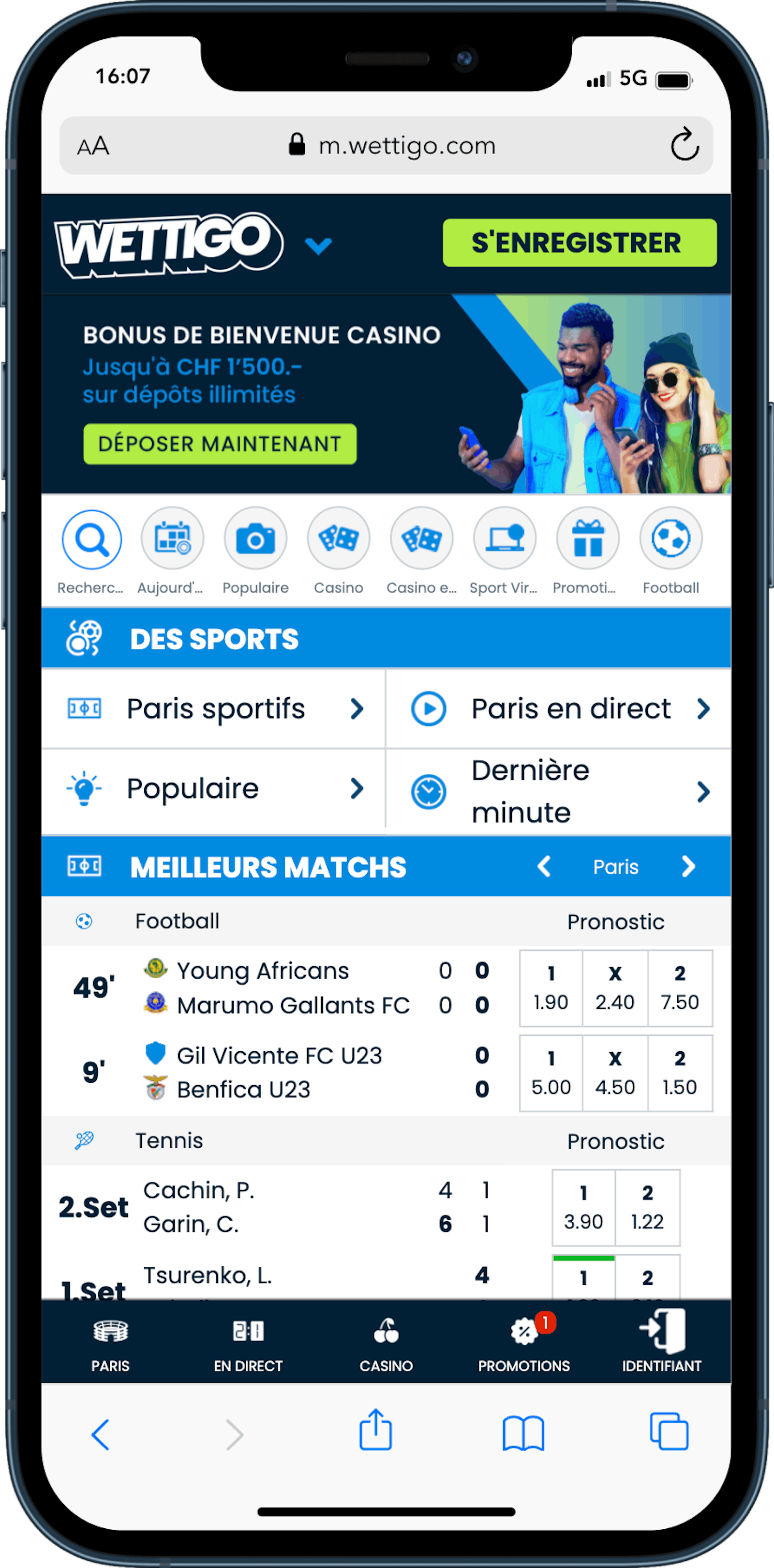 - Effectuez un premier dépôt et Wettigo vous crédite avec un bonus jusqu'à 1500 CHF